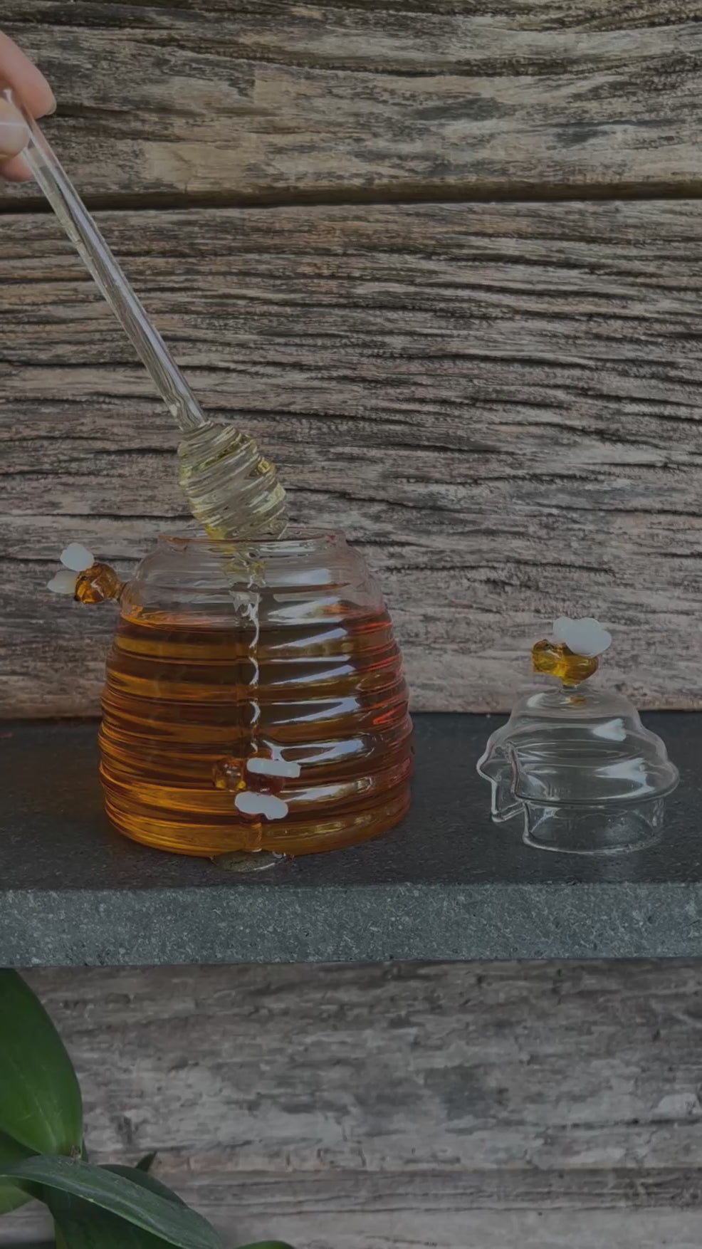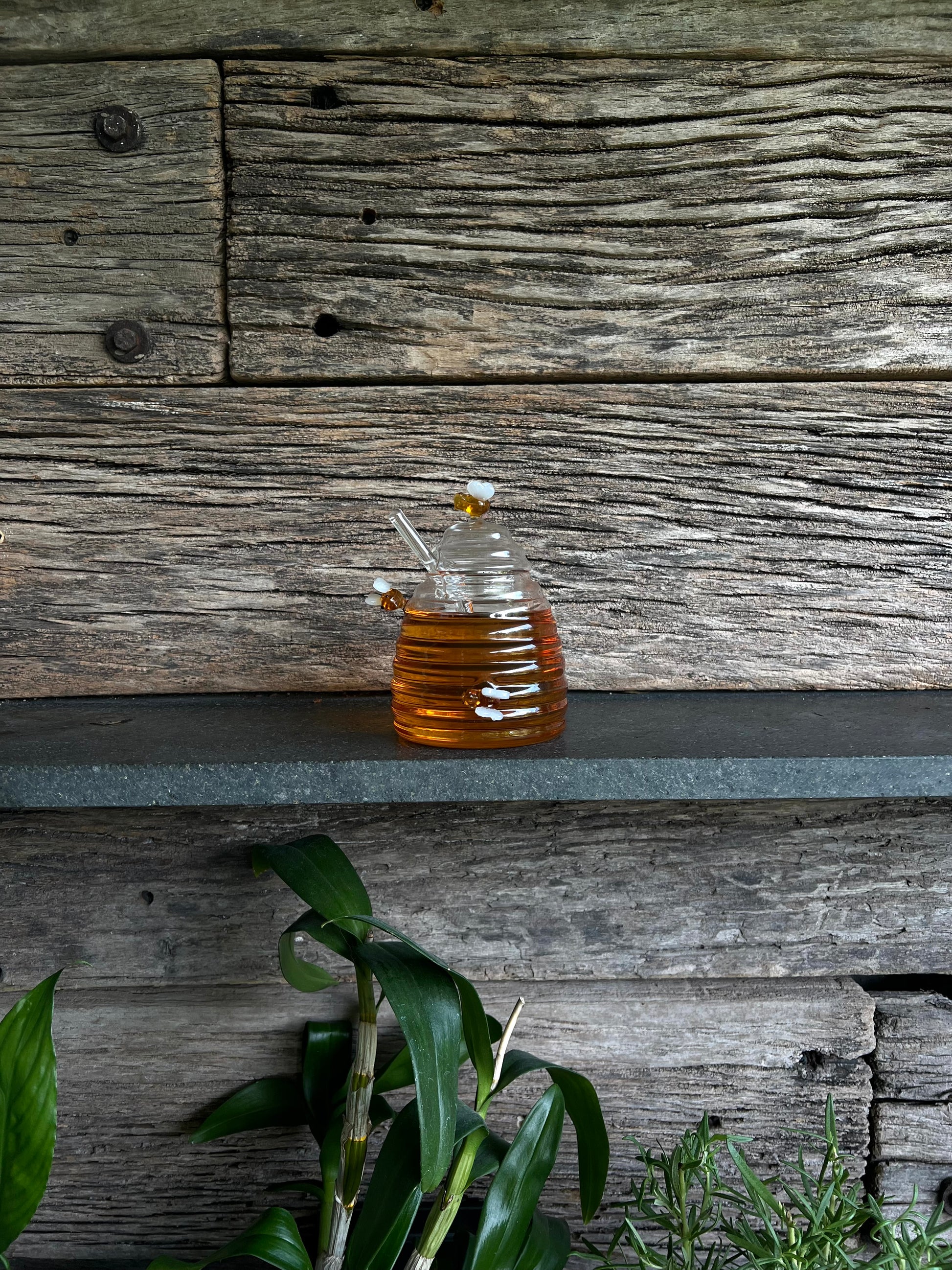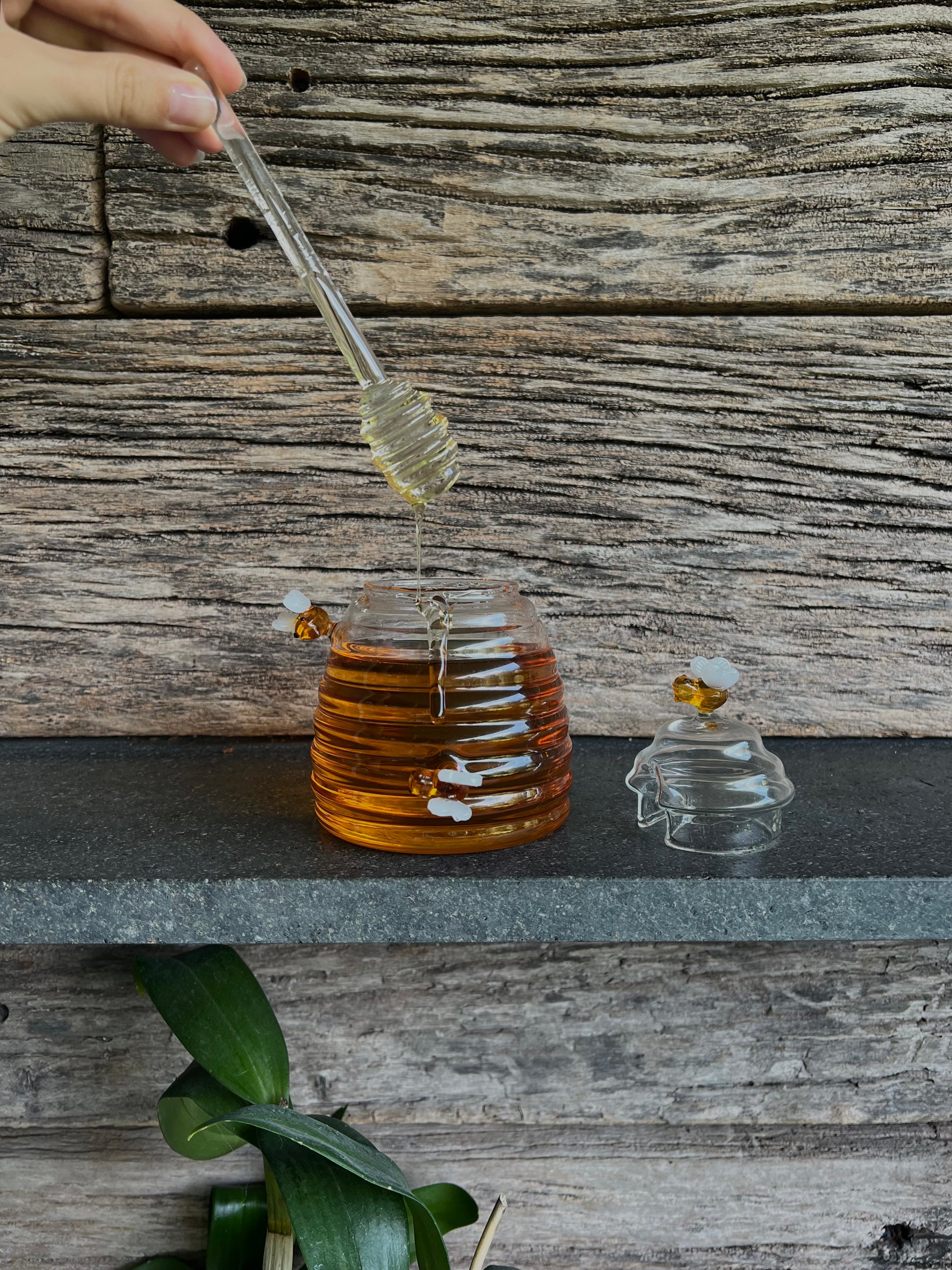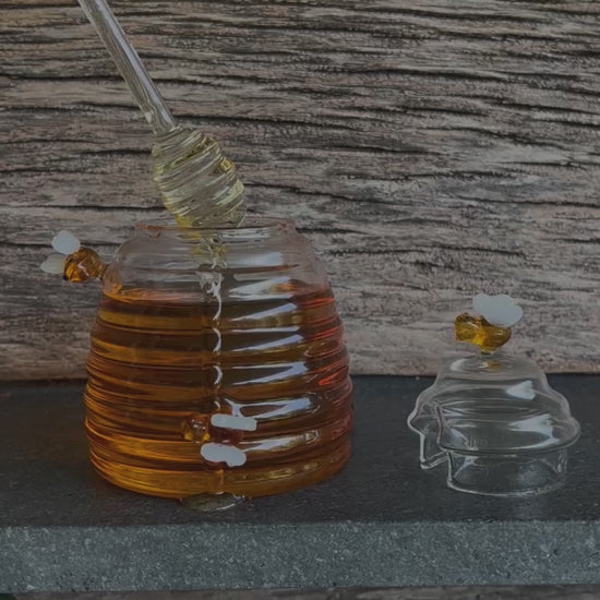 Mielera de cristal, con abejas sobre saltadas de decoración, tapa y honey dipper.