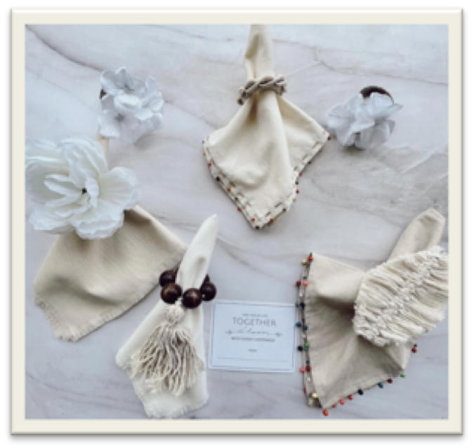Servilletero formado por cuentas de madera grandes y una mota color cruda.