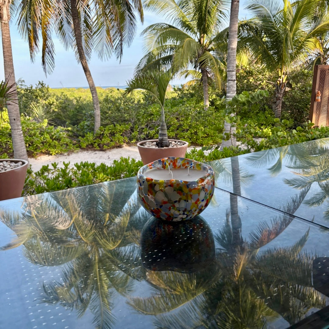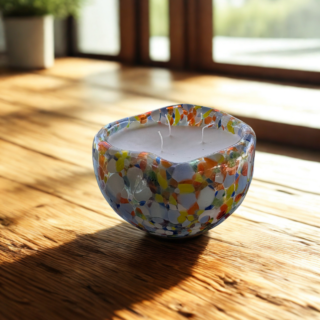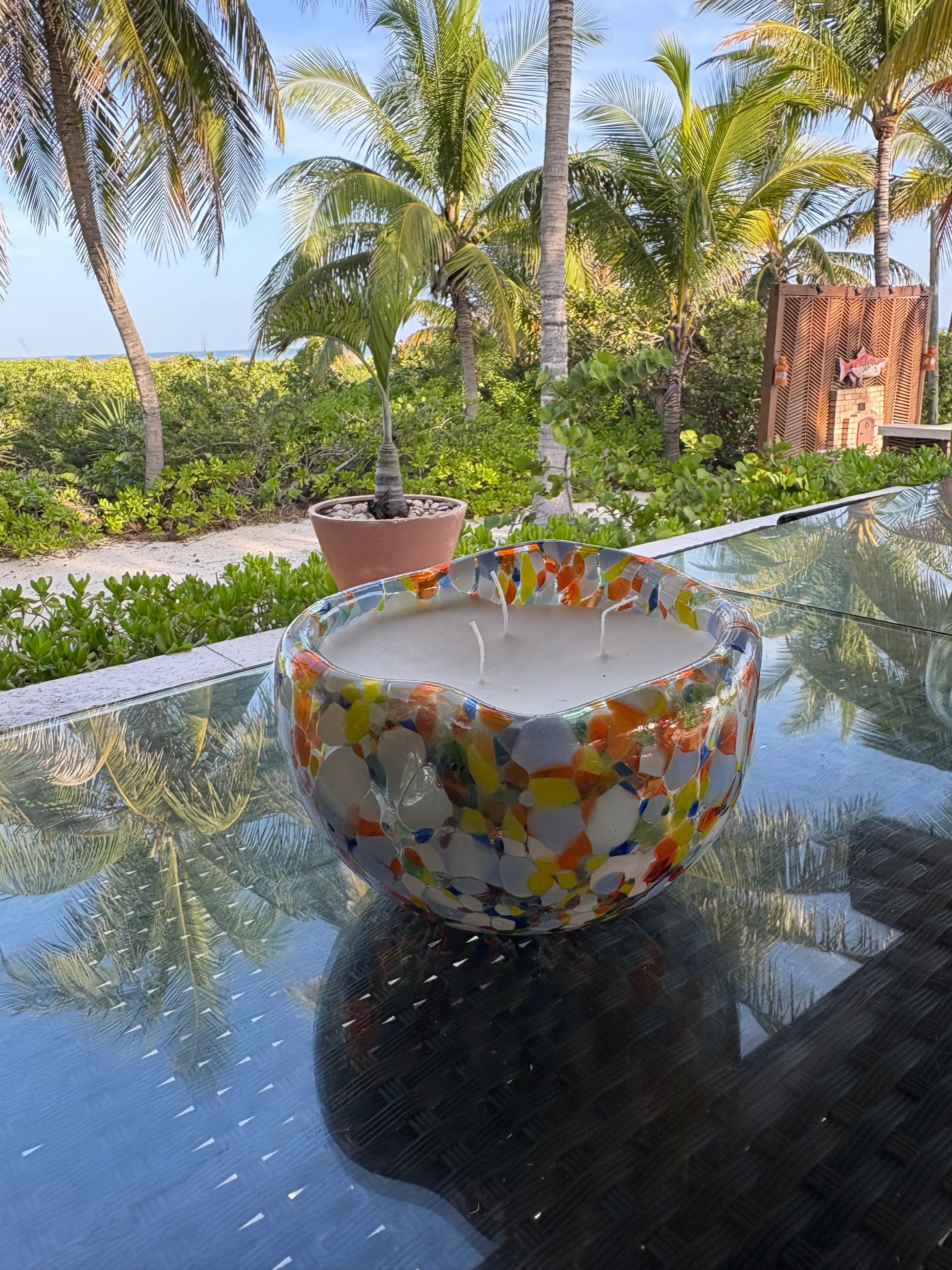 Vela irregular de vidrio soplado hecha a mano por artesanos mexicanos.